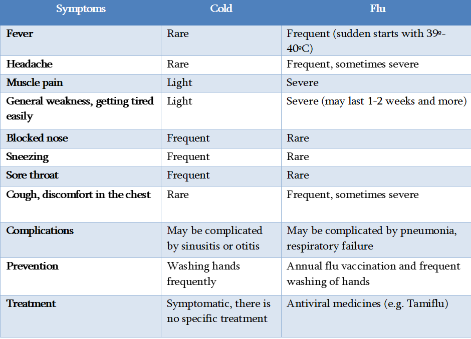 Often any respiratory viral infections are called the flue, for example, the so-called “common cold” or “enterovirus”. However, we must keep in mind that these are different diseases and, unlike the flu, the progression and the complications of “common cold” or “enterovirus” are much lighter. It should also be noted that neither influenza vaccine nor antiviral therapy of flu are effective in this case (e.g. Tamiflu).