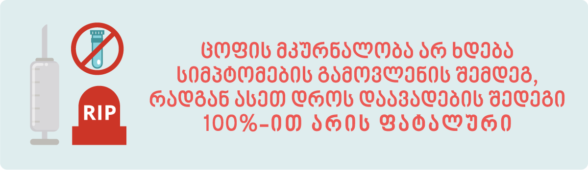 ცოფით ინფიცირების რისკის ქვეშ მყოფი ცხოველის მიერ კბენის, გაკაწრის ან რაიმე სახის კონტაქტის შემთხვევაში აუცილებელია დაუყოვნებლივ მიმართოთ ექიმ-რაბიოლოგს.