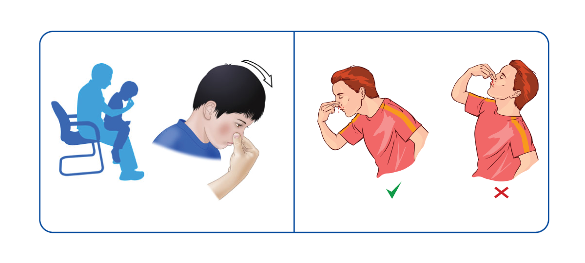 - დასვით ბავშვი და ოდნავ გადახარეთ წინ. არ დააწვინოთ ან გადააწევინოთ თავი უკან, რადგან შესაძლებელია ბავშვმა სისხლი გადაყლაპოს და მოგვიანებით აღებინოს, ხოლო გონების უეცარი დაკარგვის შემთხვევაში სისხლი გადასცდეს სასუნთქ გზებში.